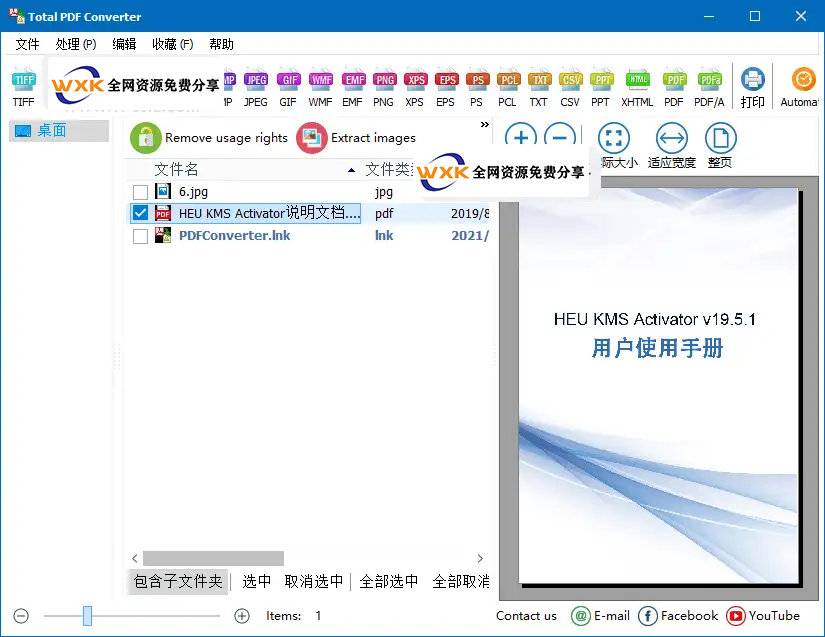 - 选择一个或多个PDF文件,点击相应的输出文件类型(如 DOC、RTF、XLS、JPEG 等)。