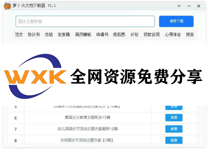 电脑端的使用逻辑与安卓端完全一致,输入关键词就能搜索下载,支持的文档类型非常丰富:范文样本、协议文件、工作总结、发言稿件、简历模板、申请文书、观后感想、工作计划、贷款合同、心得体会、调研报告等,全部免费获取。